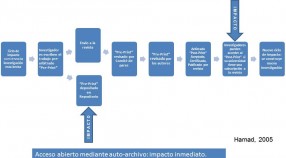 El ciclo de impacto es paralelo al proceso de publicación que comenzará una vez termina la investigación y tenemos unos resultados que comunicar. En la imagen (hacer click para ampliar) podemos ver las principales fases del proceso y las diferencias según si estamos hablando del sistema tradicional o del sistema de publicación en abierto.